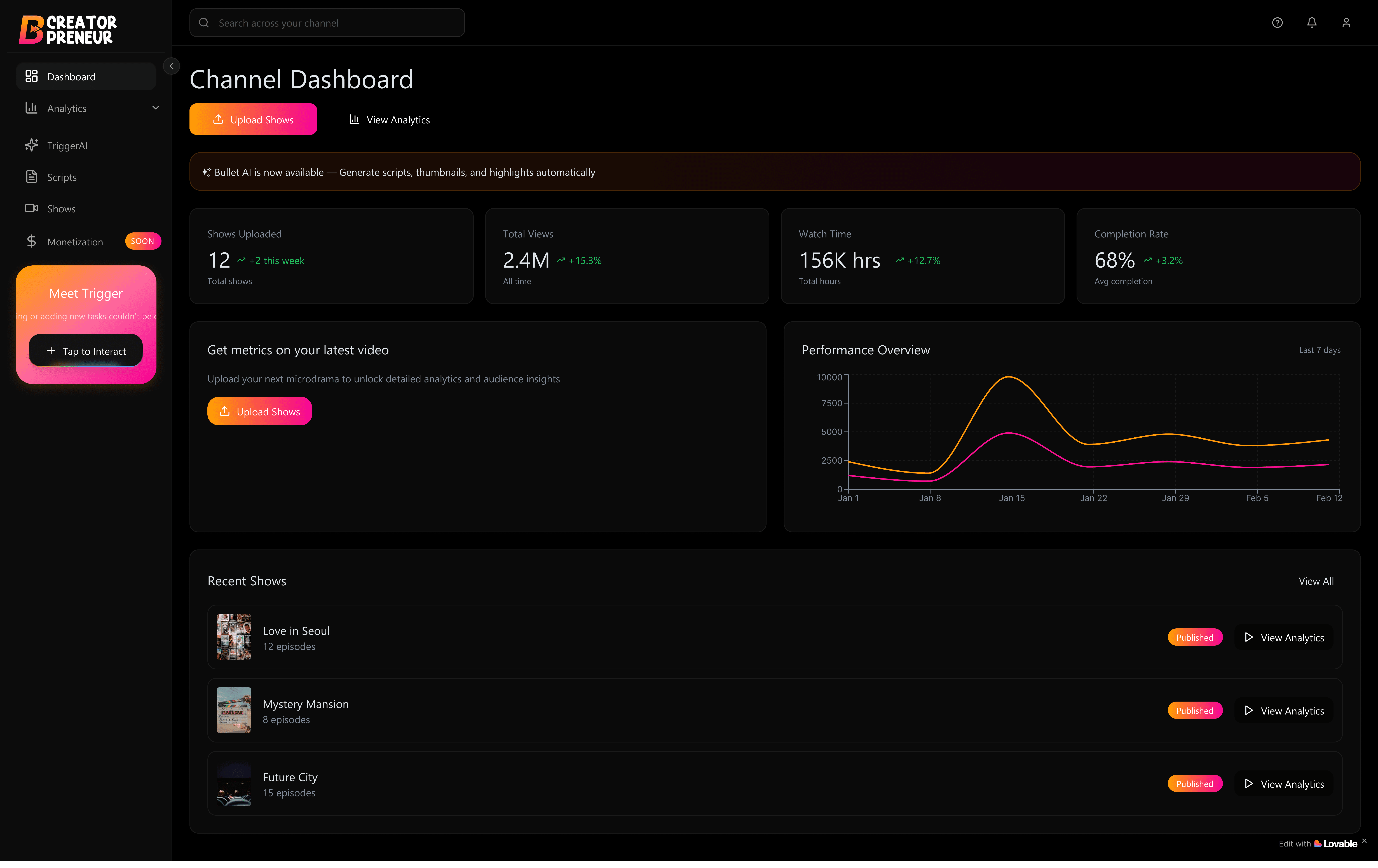 Publish, grow, and monetize your microdramas with built-in distribution, insights, and creator rewards.